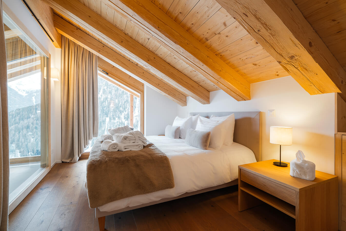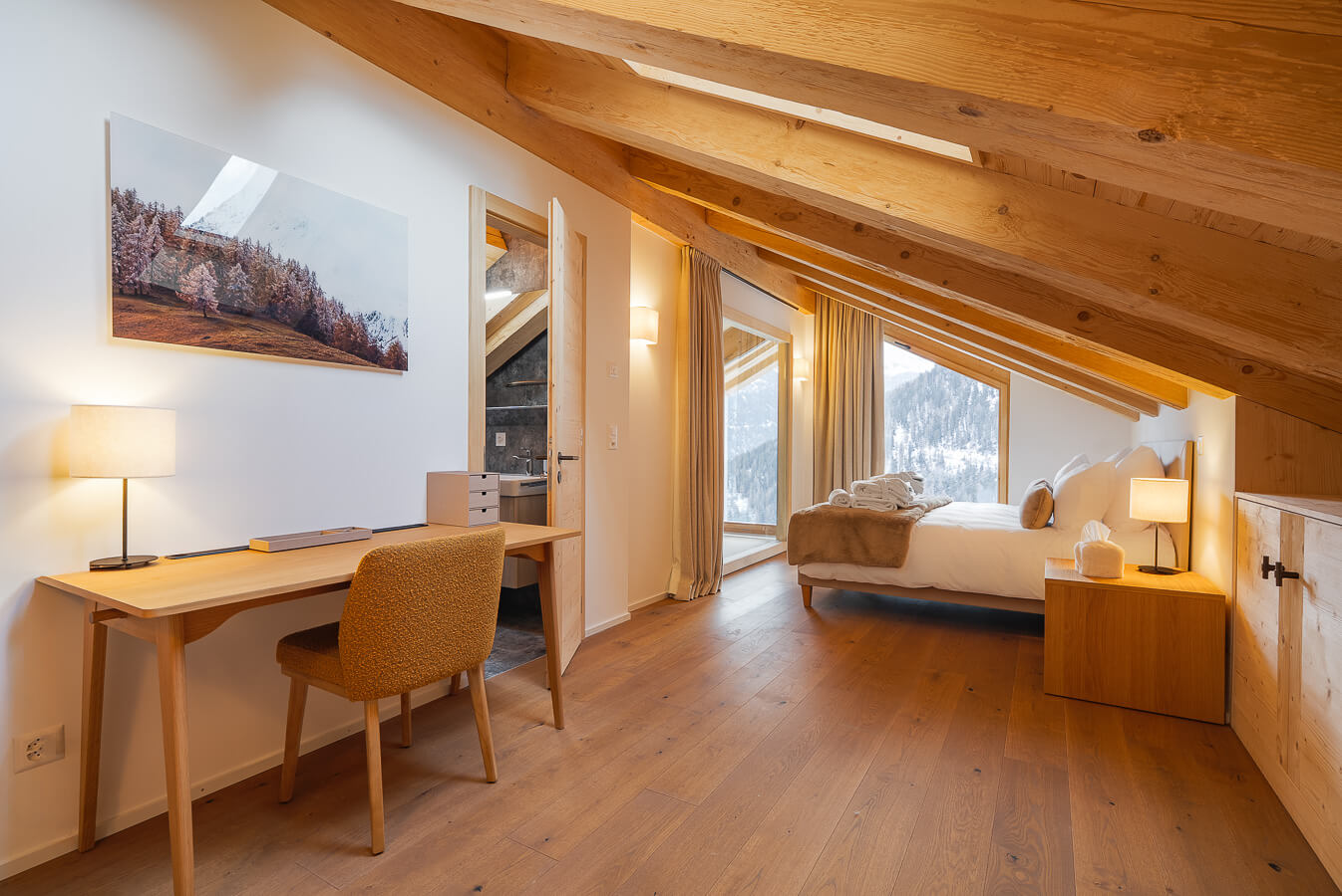 Dieses freistehende Chalet auf drei Ebenen verfügt über drei Schlafzimmer mit Doppelbett (180 × 200 cm) sowie über zwei Badezimmer mit Dusche. Der Wohnbereich bietet eine Sitzecke mit Fernseher, eine voll ausgestattete Küche, einen Holzofen und großzügige Außenbereiche mit Panoramablick auf die umliegenden Berge von Sorebois und Nava. Das Chalet ist nach Süden, Osten und Norden ausgerichtet. Zur Ausstattung gehören Haushaltsgeräte wie Geschirrspüler, Nespresso-Kaffeemaschine, notwendige Küchenutensilien usw.