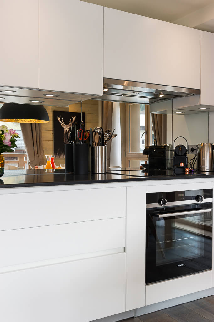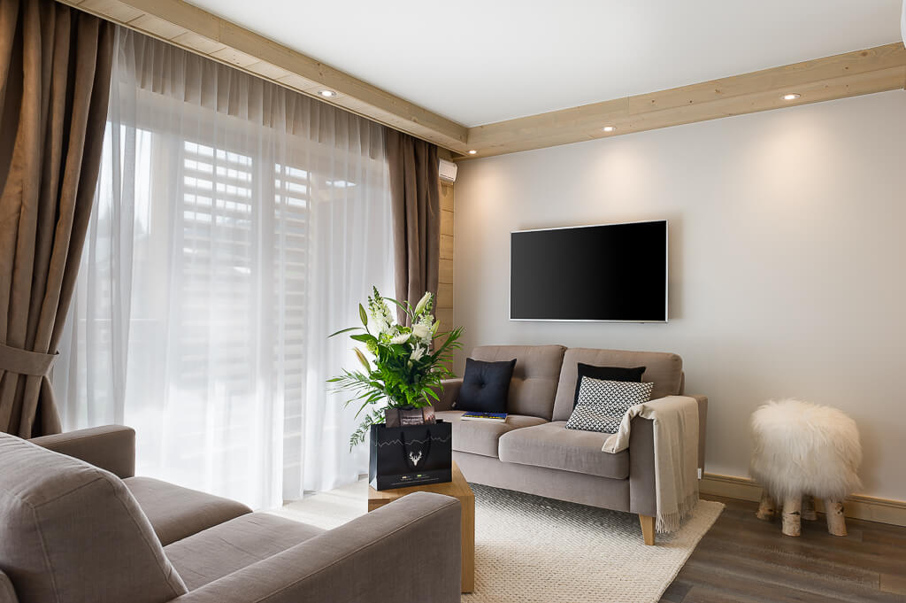 Diese Wohnung verfügt über ein Schlafzimmer mit einem Doppelbett (180×200), ein fensterloses Kabinen-Schlafzimmer mit zwei Einzelbetten (90×200) sowie über ein Badezimmer. Der Wohnbereich ist mit einer Sitzecke und einem Fernseher sowie einer komplett ausgestatteten offenen Küche eingerichtet. Ein möblierter Balkon rundet den Wohnraum ab. Zur Ausstattung gehören Haushaltsgeräte wie ein Geschirrspüler, eine Nespresso-Kaffeemaschine, Küchenutensilien usw.