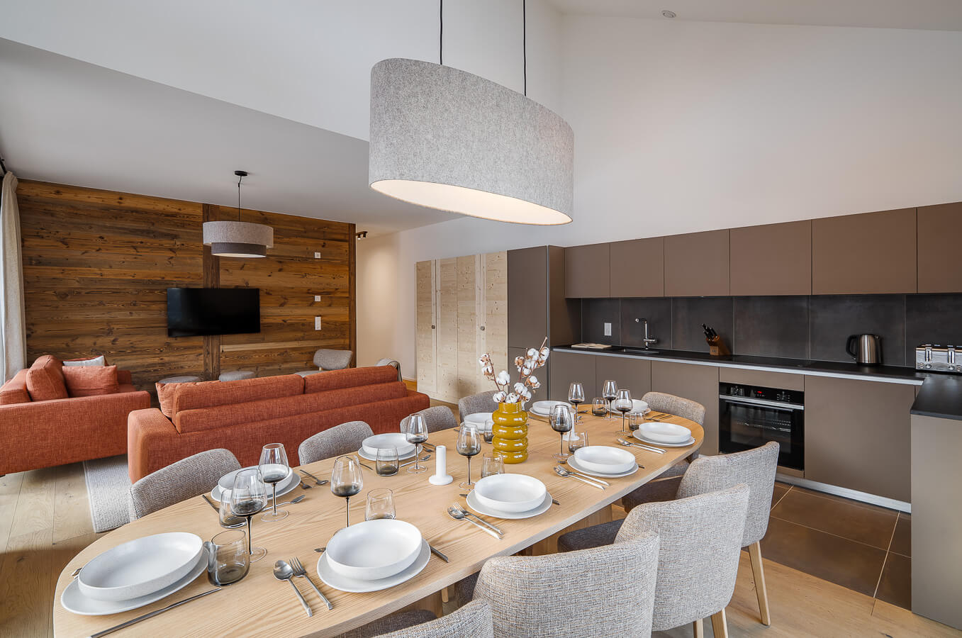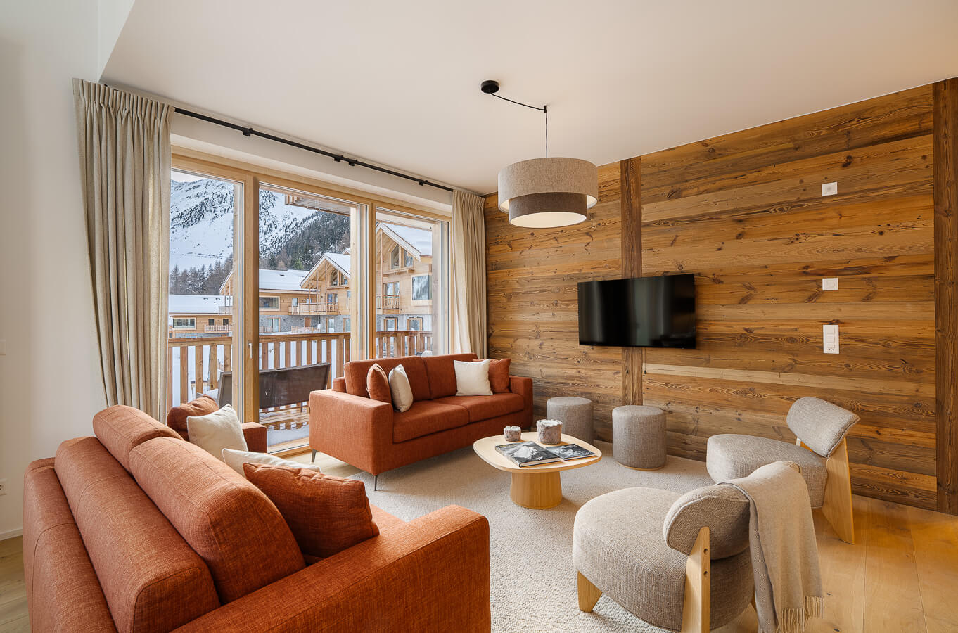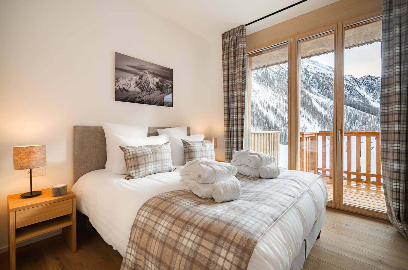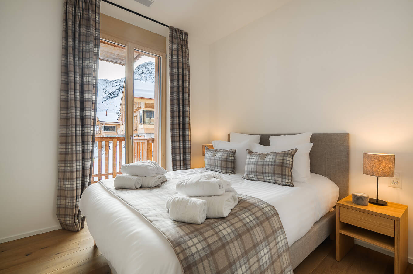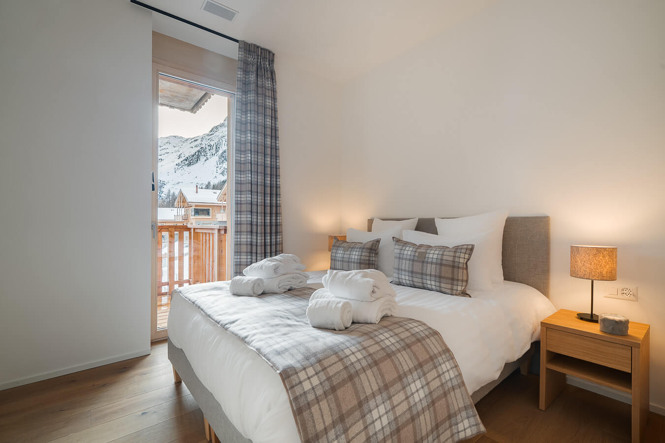 Diese Wohnung verfügt über vier Schlafzimmer mit Doppelbetten (180 × 210 cm, 160 × 200 cm), einen Durchgangsbereich, der als Kabine mit einem Etagenbett dient, sowie über drei Badezimmer. Der Wohnbereich bietet eine Sitzecke mit Fernseher und eine voll ausgestattete offene Küche. Drei Balkone ergänzen den Wohnraum. Zur Ausstattung der Wohnung gehören Haushaltsgeräte wie Geschirrspüler, Nespresso-Kaffeemaschine, notwendige Küchenutensilien usw.