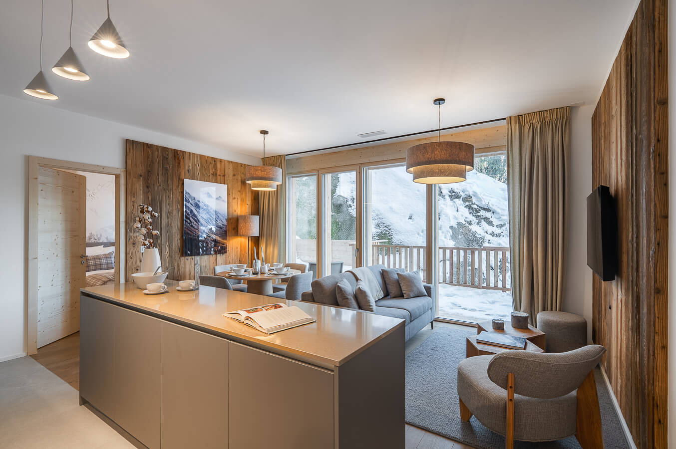 Diese Wohnung verfügt über ein Schlafzimmer mit Doppelbett (180 × 200 cm), ein ausziehbares Schlafsofa im Wohnbereich sowie über ein Badezimmer. Der Wohnbereich bietet eine Sitzecke mit Fernseher und eine voll ausgestattete offene Küche. Eine möblierte Terrasse ergänzt den Wohnraum. Zur Ausstattung der Wohnung gehören Haushaltsgeräte wie Waschmaschine, Geschirrspüler, Nespresso-Kaffeemaschine, notwendige Küchenutensilien usw.