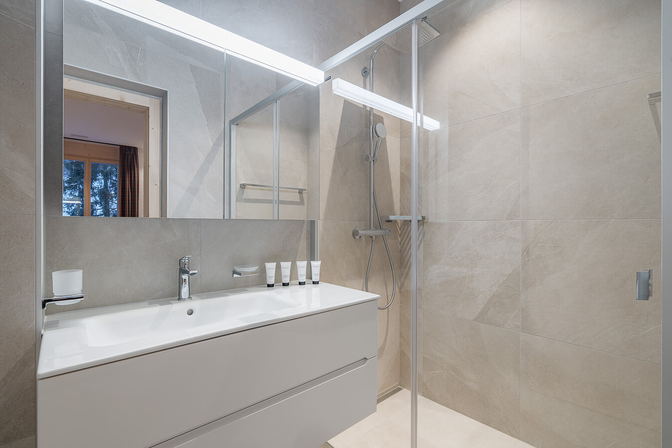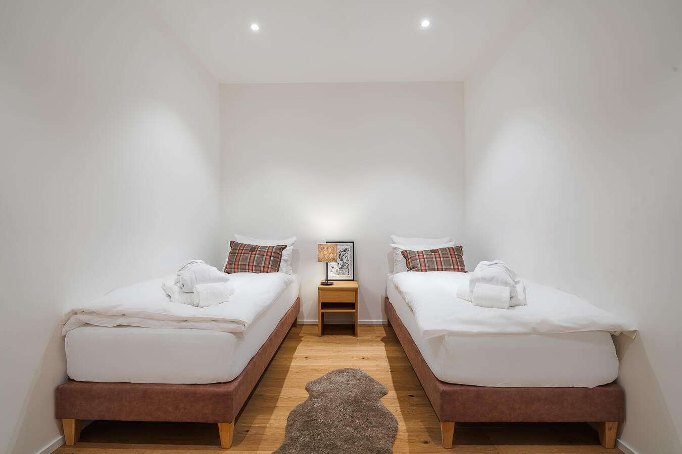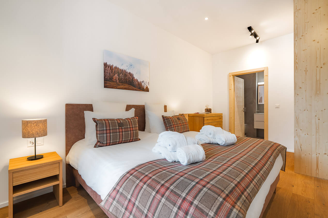 Diese Wohnung verfügt über ein Schlafzimmer mit Doppelbett (180 × 200 cm), ein fensterloses Schlafzimmer mit zwei Einzelbetten (90 × 200 cm) sowie über zwei Badezimmer. Der Wohnbereich bietet eine Sitzecke mit Fernseher und eine voll ausgestattete offene Küche. Möblierte Balkone ergänzen den Wohnraum. Zur Ausstattung der Wohnung gehören Haushaltsgeräte wie Waschmaschine und Trockner, Geschirrspüler, Nespresso-Kaffeemaschine, notwendige Küchenutensilien usw.