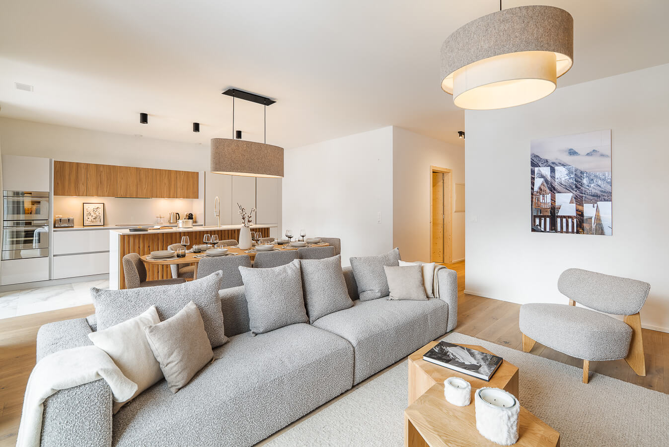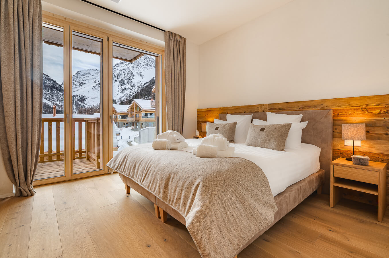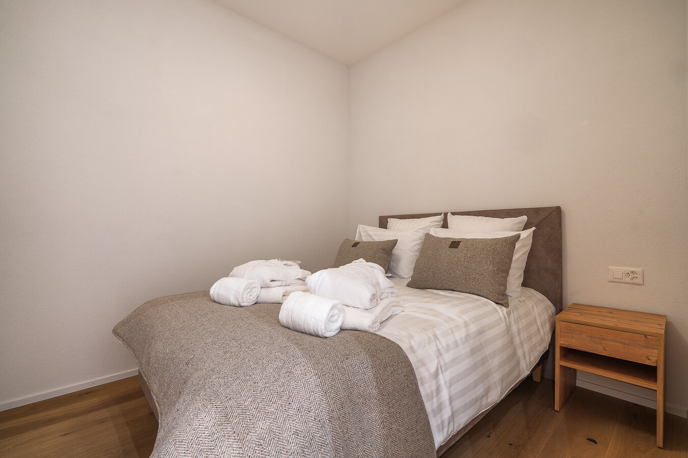 Diese Wohnung verfügt über zwei Schlafzimmer mit Doppelbett (180 × 200 cm), zwei fensterlose Schlafzimmer mit Doppelbetten (140 × 200 cm) sowie über zwei Badezimmer. Der Wohnbereich bietet eine Sitzecke mit Fernseher und eine voll ausgestattete offene Küche. Möblierte Balkone ergänzen den Wohnraum. Zur Ausstattung der Wohnung gehören Haushaltsgeräte wie Waschmaschine, Geschirrspüler, Nespresso-Kaffeemaschine, notwendige Küchenutensilien usw.