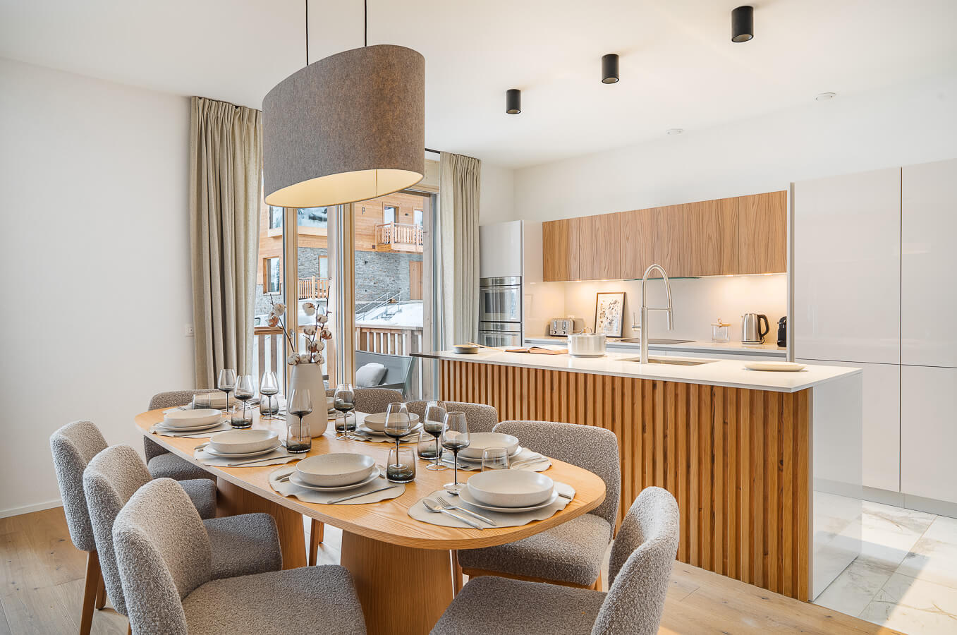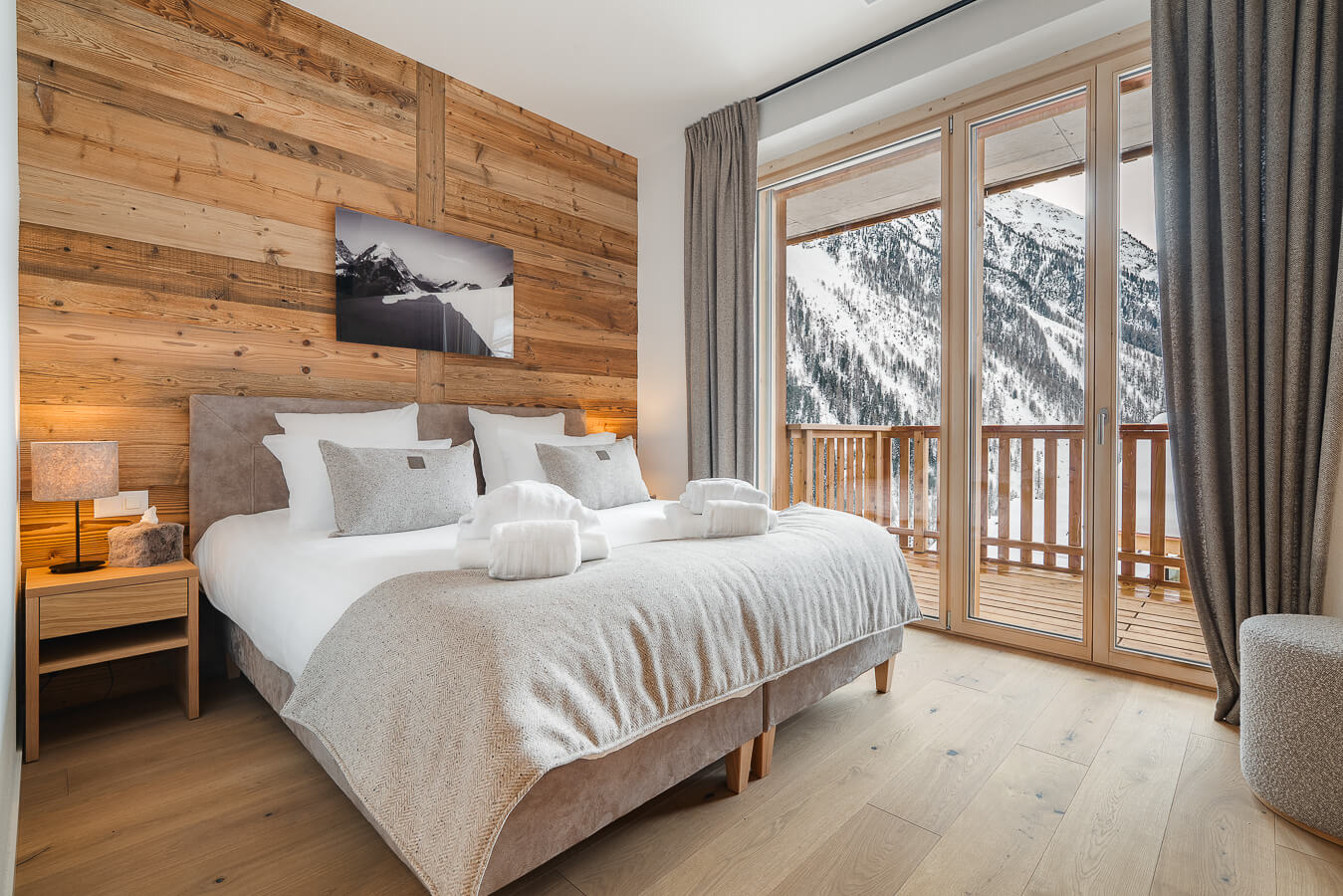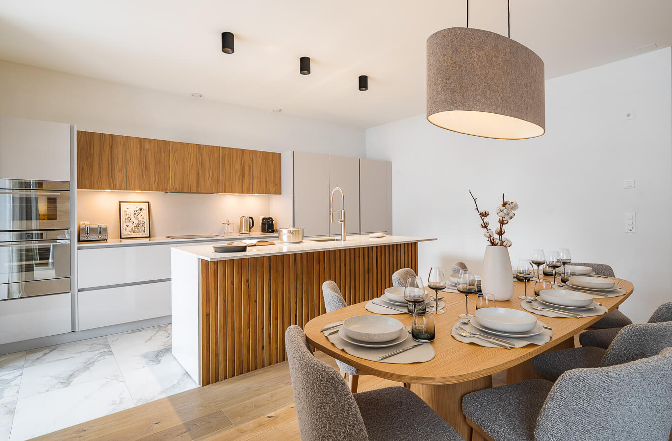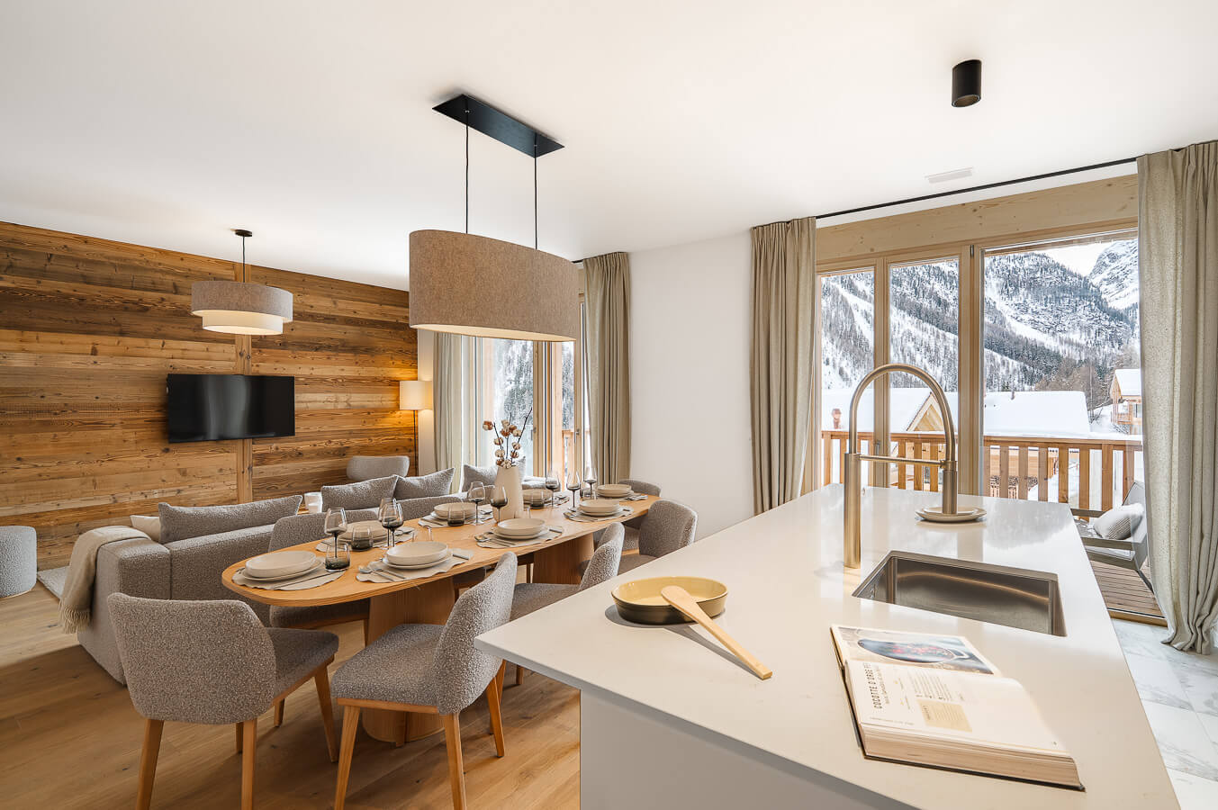 Diese Wohnung verfügt über zwei Schlafzimmer mit Doppelbett (180 × 200 cm), zwei fensterlose Schlafzimmer mit Doppelbetten (140 × 200 cm) sowie über zwei Badezimmer. Der Wohnbereich bietet eine Sitzecke mit Fernseher und eine voll ausgestattete offene Küche. Möblierte Balkone ergänzen den Wohnraum. Zur Ausstattung der Wohnung gehören Haushaltsgeräte wie Waschmaschine, Geschirrspüler, Nespresso-Kaffeemaschine, notwendige Küchenutensilien usw.