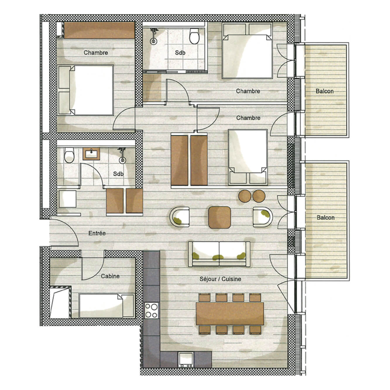 Diese Wohnung verfügt über zwei Schlafzimmer mit Doppelbetten (180 × 200 cm, 140 × 200 cm), ein fensterloses Schlafzimmer mit Doppelbett (180 × 200 cm), ein Kabinenschlafzimmer mit Etagenbett sowie über zwei Badezimmer. Der Wohnbereich bietet eine Sitzecke mit Fernseher und eine voll ausgestattete offene Küche. Möblierte Balkone ergänzen den Wohnraum. Zur Ausstattung der Wohnung gehören Haushaltsgeräte wie Waschmaschine, Geschirrspüler, Nespresso-Kaffeemaschine, notwendige Küchenutensilien usw.
