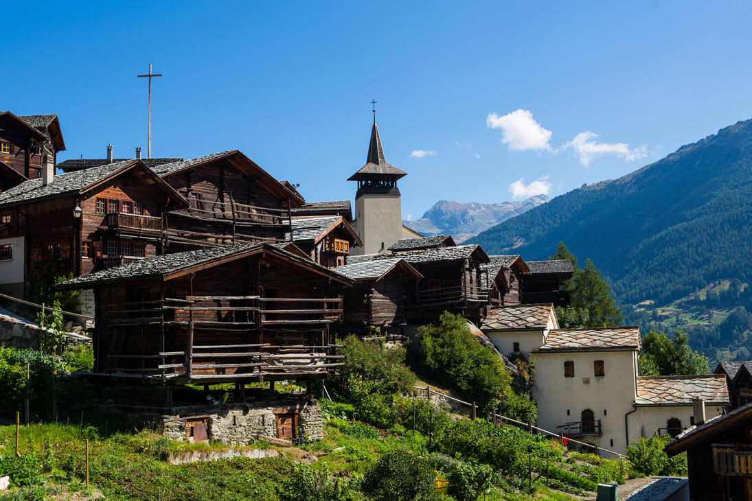 Niché au cœur du Val d’Anniviers, Grimentz dévoile en été toute la richesse de son patrimoine alpin. Les raccards, greniers et mayens, posés en équilibre entre ciel et montagne, racontent la vie rustique d’autrefois, marquée par les saisons, l’agriculture et les savoir-faire ancestraux. Chaque bâtisse en bois de mélèze, chaque pierre séchée au soleil, témoigne d’une ingéniosité tournée vers la nature. L’été, les ruelles animées accueillent fêtes locales, expositions artisanales et visites patrimoniales, prolongeant les traditions vivantes de la vallée. À Grimentz, passé et présent se rencontrent dans un décor montagnard préservé, pour une immersion pleine de sens et d’authenticité.