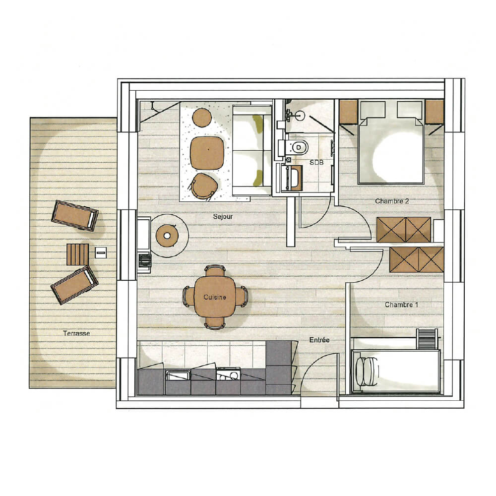 Ce chalet appartement dispose d’une chambre avec un lit double (160*200), d’une chambre avec un lit superposé ainsi que d’une salle de bain avec douche. La pièce de vie bénéficie d'un coin salon avec une télévision, d'une cuisine toute équipée, d’un poêle à bois et de deux terrasses dont une orientée plein sud. Ce chalet bénéficie d'une double exposition : sud et nord. Il dispose d'appareils électroménagers tels qu’un lave vaisselle, une machine à café Nespresso, le nécessaire de cuisine, etc.
