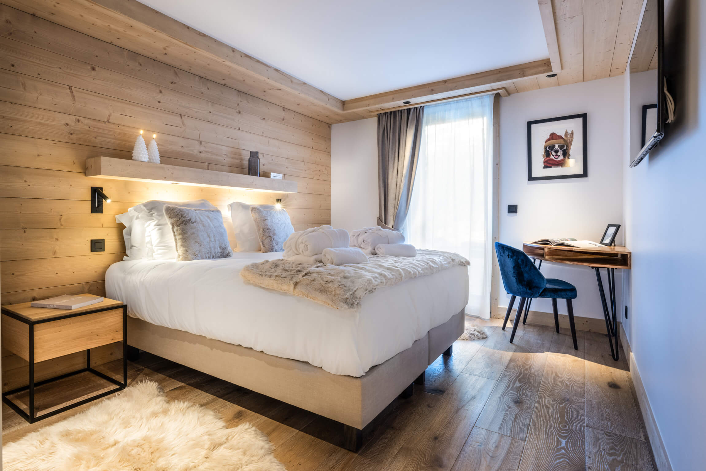 Ce chalet appartement dispose de trois chambres avec un lit double (180*200) ainsi que de trois salles de bains attenantes avec douche. La pièce de vie bénéficie d'un coin salon avec une télévision, d'une cuisine toute équipée, d’un poêle à bois et d’un balcon orienté sud-ouest. Ce chalet s’ouvre sur toutes les expositions, pour une lumière et une vue changeantes tout au long de la journée. Il dispose d'appareils électroménagers tels qu'un lave vaisselle, une machine à café Nespresso, le nécessaire de cuisine, etc.
