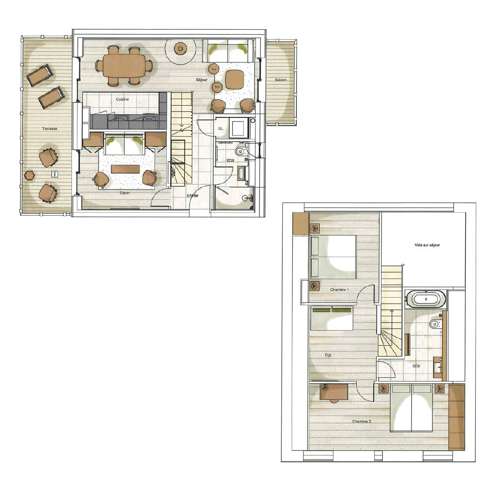 Ce chalet en duplex vous offre deux niveaux de bonheur pour votre séjour à la montagne. Découvrez le plan intérieur de ce chalet pour comprendre son aménagement intérieur et profiter de superbes espaces de vie.