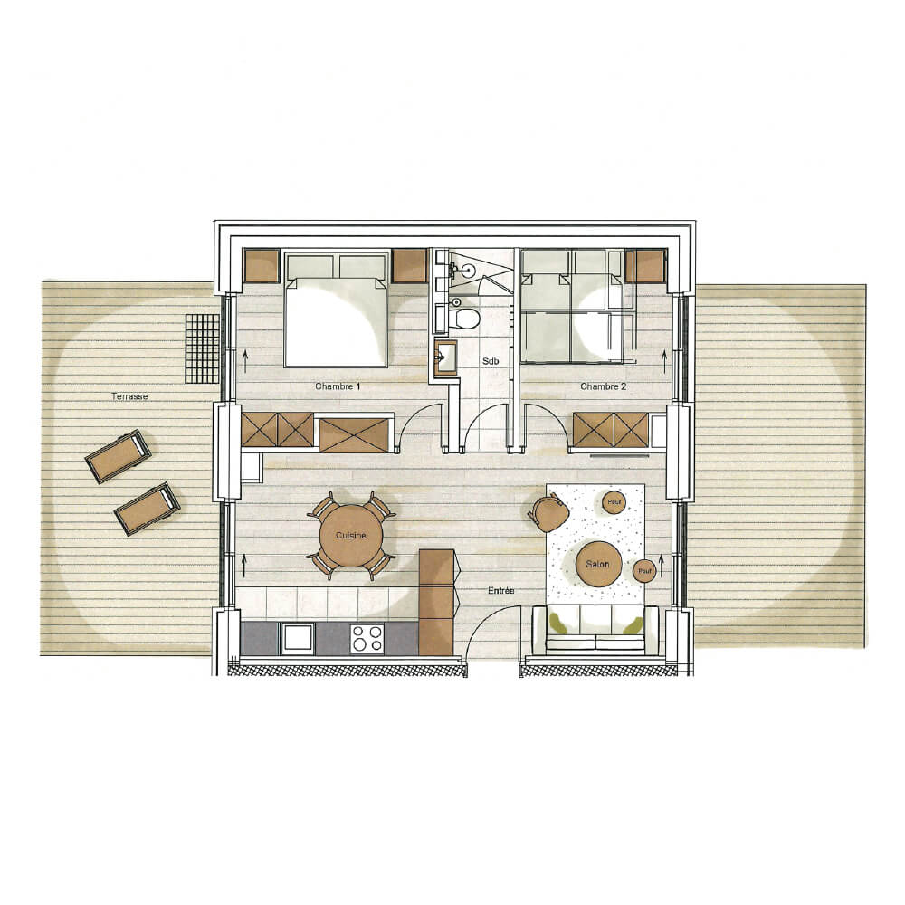 Ce chalet appartement dispose d’une chambre avec un lit double (180*200), d’une chambre avec un lit superposé (110*200) ainsi que d’une salle de bain avec douche. La pièce de vie bénéficie d'un coin salon avec une télévision, d'une cuisine toute équipée et de deux terrasses dont une orientée plein sud. Ce chalet bénéficie d'une double exposition : sud et nord. Il dispose d'appareils électroménagers tels qu’un lave vaisselle, une machine à café Nespresso, le nécessaire de cuisine, etc.