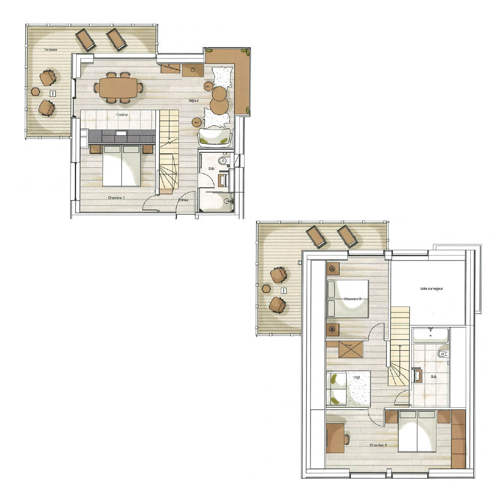 Ce chalet en duplex vous offre deux niveaux de bonheur pour votre séjour à la montagne. Découvrez le plan intérieur de ce chalet pour comprendre son aménagement intérieur et profiter de superbes espaces de vie.
