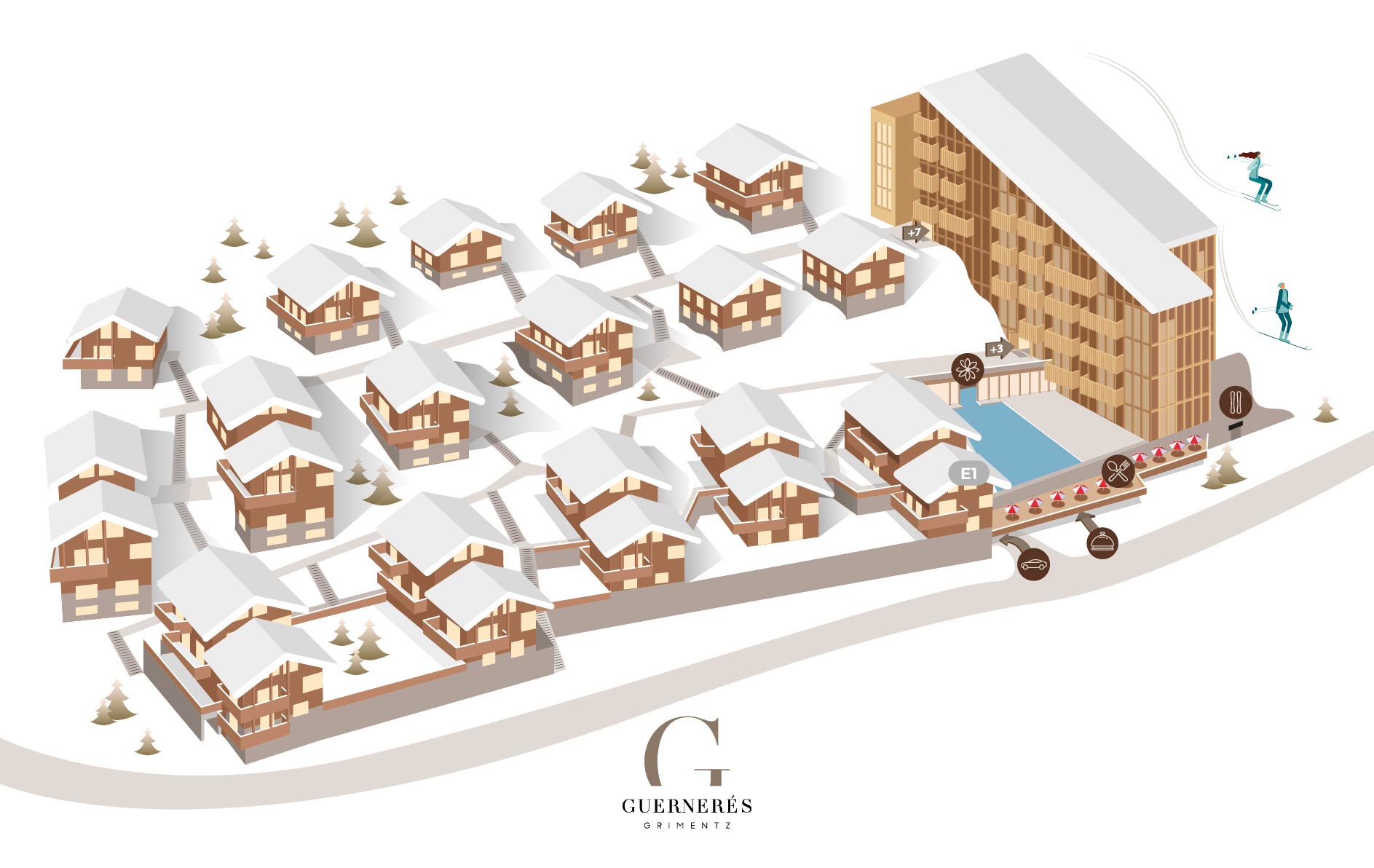 Le chalet individuel E1, situé à l’extrémité droite côté nord en ligne inférieure de la partie Chalets du resort Guernerés, s’étend sur 3 niveaux et offre une superficie de 178 m², pouvant accueillir jusqu'à 8 personnes.