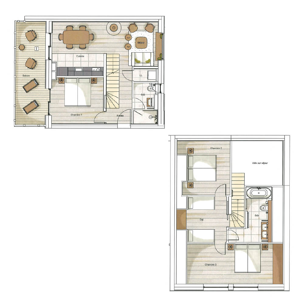 Ce chalet en duplex vous offre deux niveaux de bonheur pour votre séjour à la montagne. Découvrez le plan intérieur de ce chalet pour comprendre son aménagement intérieur et profiter de superbes espaces de vie.